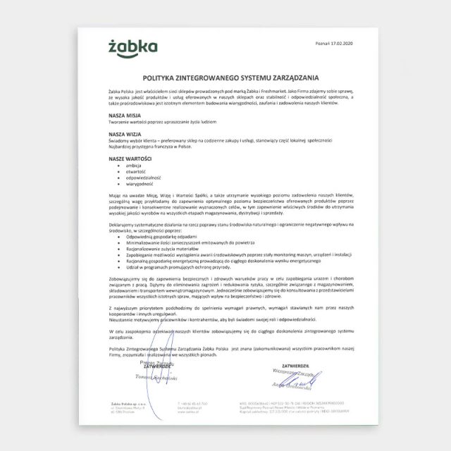 Żabka Group continues to develop its Integrated Management System (IMS), which consists of 5 international standards: ISO 22000:2018, which guarantees food safety, ISO 14001:2015, which is a guarantee of environmental care, ISO 45001:2018 covering the health and safety management system, and ISO 50001:2018 on effective energy management.