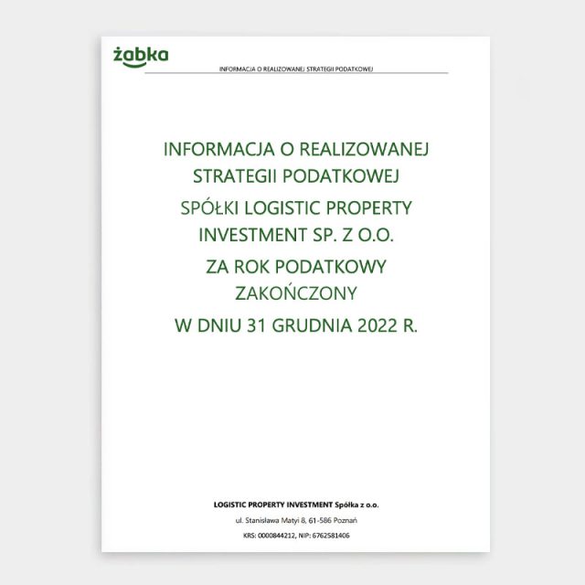 Logistic Property Investment sp. z.o.o. (LPI lub „Spółka”) jako podatnik podatku dochodowego od osób prawnych o obrotach przekraczających 50 mln EUR wypełnia obowiązek sporządzania i opublikowania informacji o realizowanej strategii podatkowej, zawierającej informacje określone w art. 27c ust. 2 Ustawy o podatku dochodowym od osób prawnych.